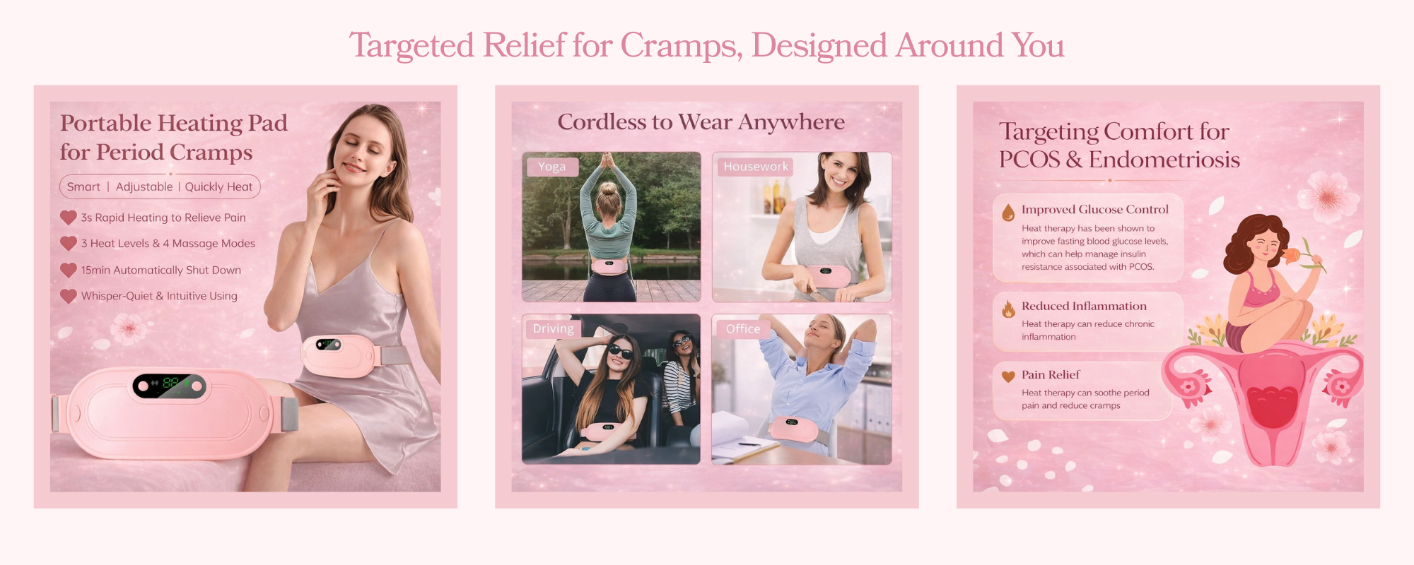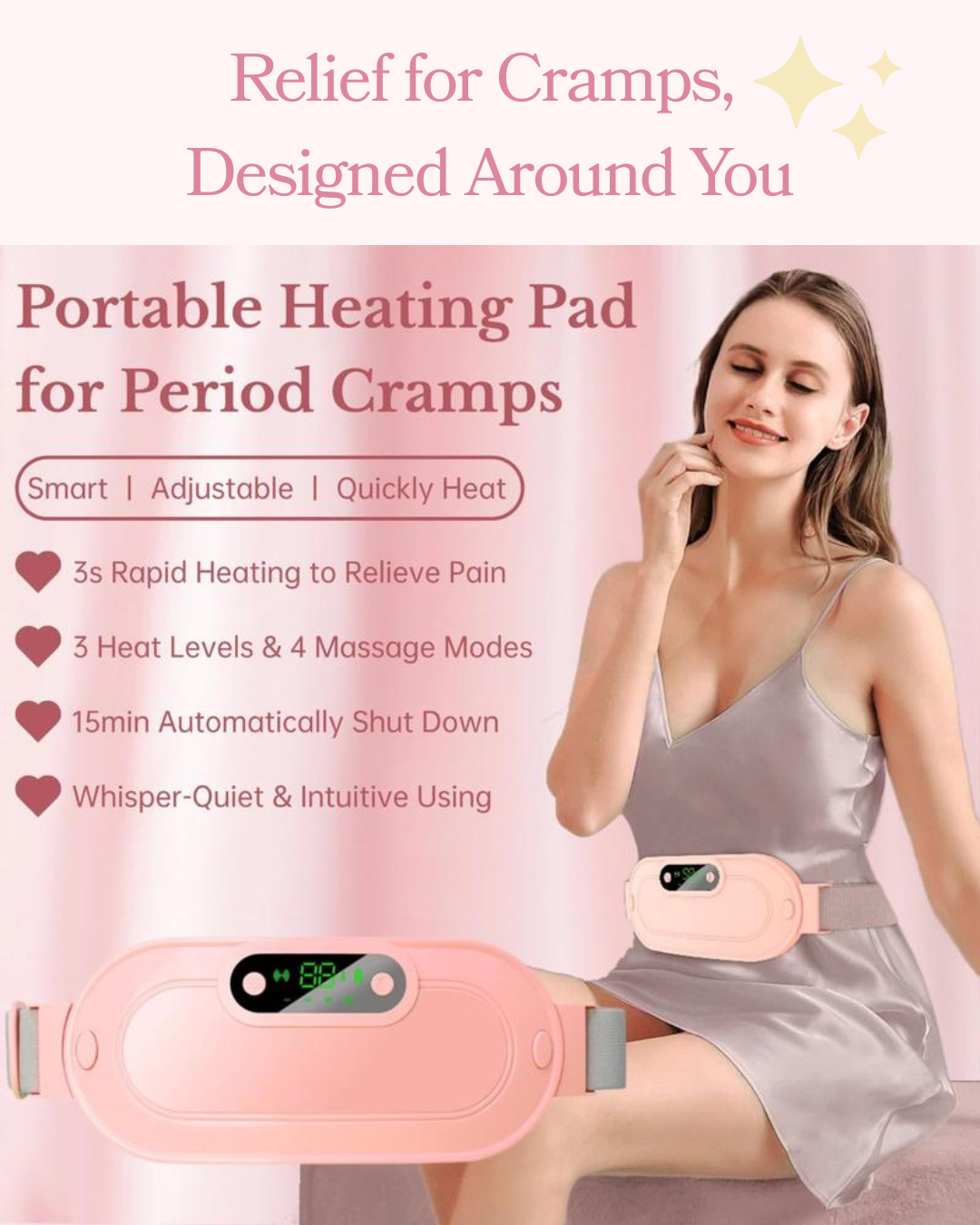Our wearable heating pad provides targeted warmth and optional vibration to help ease menstrual cramps and cycle-related discomfort, supporting your body when it needs it most.