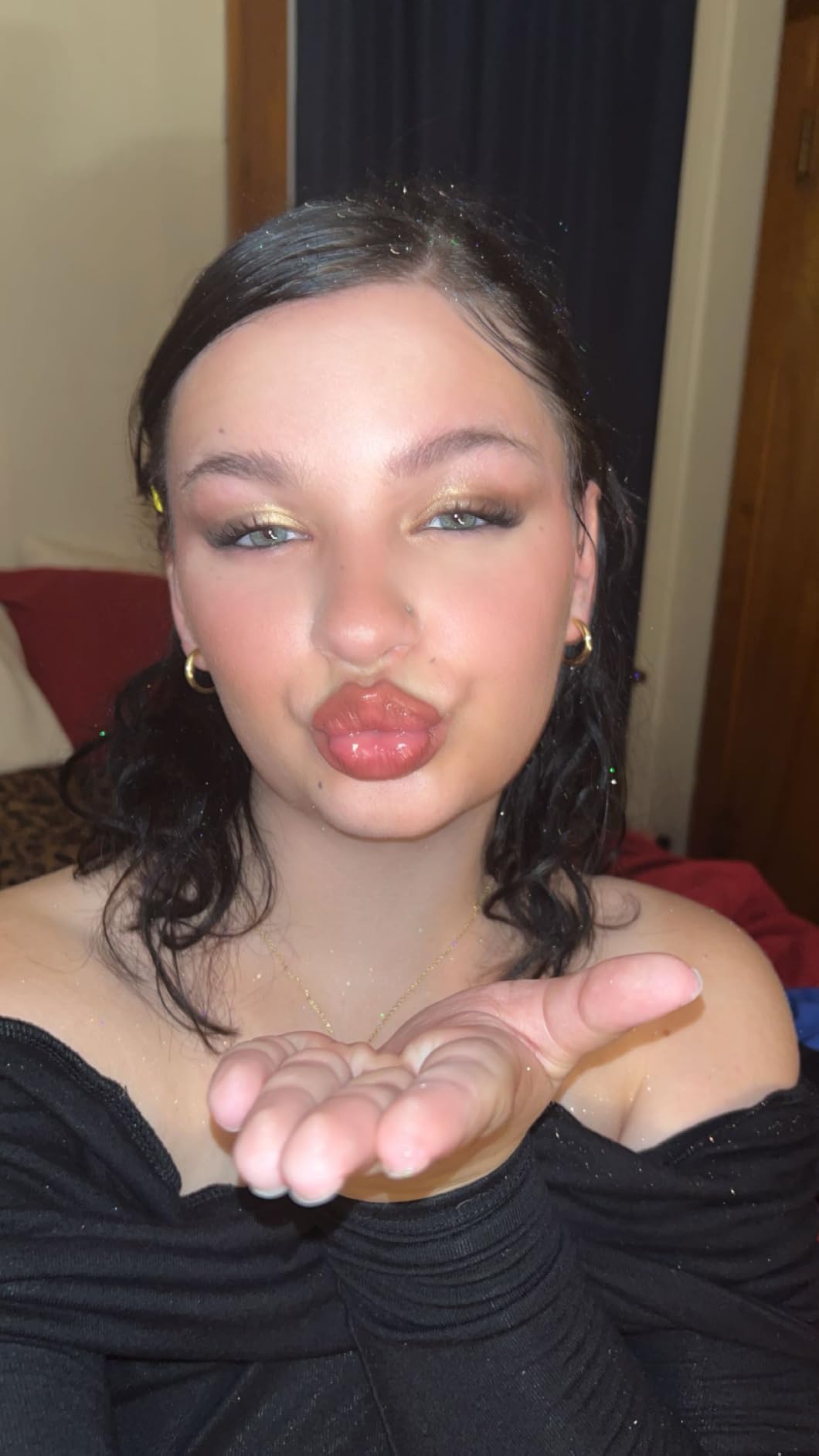 I didn’t expect the shimmer to be this bright but it looks gorgeous on my skin. It layers well and doesn’t feel sticky. I’m wearing it for every holiday event now lol